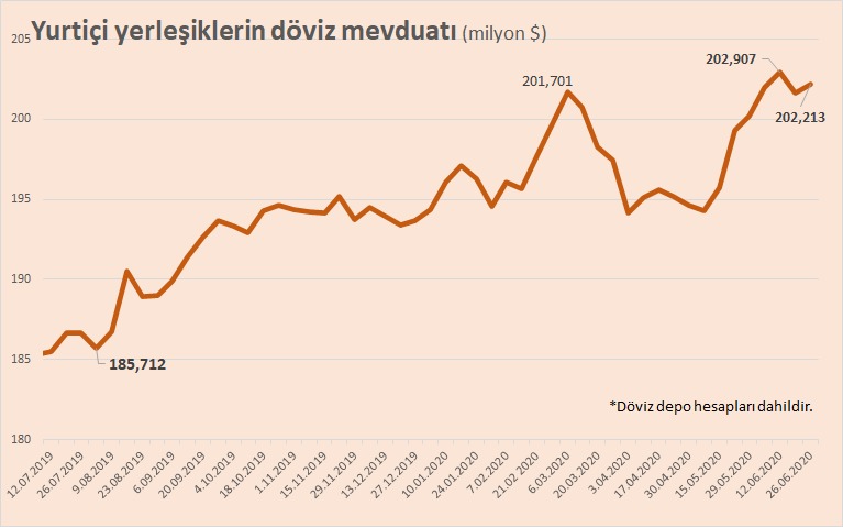 Merkez Bankası, haftalık para banka istatisitiklerine göre, 26 Haziran haftasında vatandaşların döviz hesaplarındaki toplam tutar bir önceki haftaya göre 575 milyon dolar arttı ve 202 milyar 213 milyon dolara çıktı. Yaşanan artışın 273 milyon doları bireysel hesaplardan; 302 milyon doları ise tüzel hesaplardan kaynaklandı.
