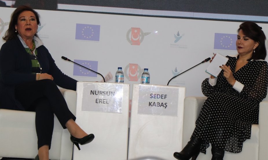 Gazeteci Nursun Erel’in moderatör olduğu “Basın ve İfade Özgürlüğü İklimi” başlığı altındki panelde “Cumhurbaşkanına Hakaret” iddiasıyla yargılanan Sedef Kabaş konuktu.