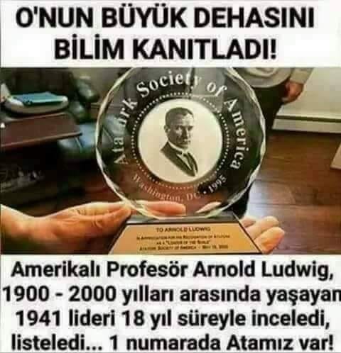 ABD’li psikiyatri profesörü Arnold Ludwig, ‘King of the Mountain’ adlı bir kitap yayımladı. Kitaba göre, 2 bin etkin lider hakkında 18 yıl boyu süren bir araştırma yapan profesör, bunlar arasından 377 devlet adamı-lider tespit etmiş ve bunları ayırmış. Profesör, belirlediği 200 kriteri bu 377 devlet adamına-lidere tek tek uygulamış. Sonra onlara 1’den 31’ekadar puan vermiş. Siyasi Büyüklük Ölçütü olarak tanımladığı bu sıralamaya göre: Nehru 25, Roosevelt 30, Fidel Castro 23, Lenin 28, Churchill 22, Golda Meir 12, Kennedy 15 puan almış. Sıralamada 31 puan alan tek isim ise Mustafa Kemal Atatürk ol muş. Yani, 31 puanla ve büyük vizyon sahibi sıfatıyla 20’nci yüzyılın en büyük devlet adamlığına Atatürk layık görülmüş.