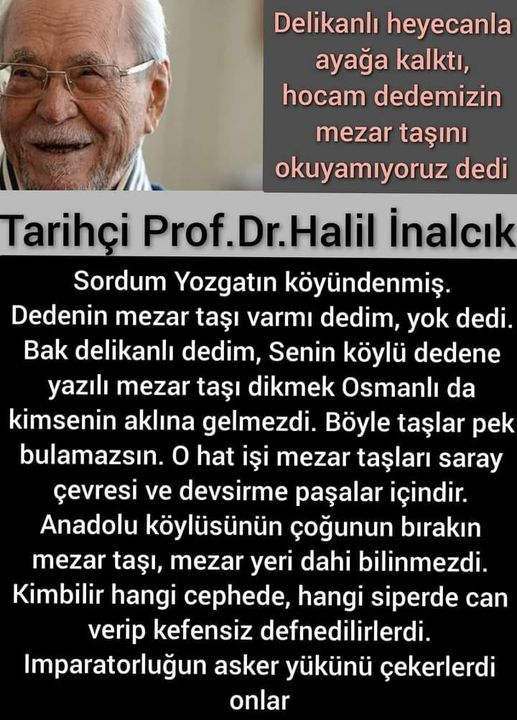 ‘Bak delikanlı’ dedim. ‘Senin köylü dedene yazılı mezar taşı dikmek Osmanlıda kimsenin aklına gelmezdi. Böyle taşlar pek bulamazsın. O, hat işi mezar taşları Saray çevresi ve devşirme paşalar içindir. Anadolu köylüsünün çoğunun, bırakın meza taşı, mezar yeri dahi bilinmezdi. Kimbilir hangi cephede hangi siperde can verip kefensiz defnedilirlerdi. İmparatorluğun asker yükünü çekerlerdi onlar.’