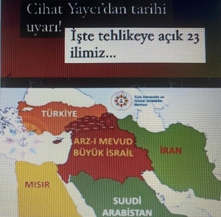 Emekli tümamiral Doç. Dr. Cihat Yaycı, olası Büyük İsrail Projesini resmeden bir haritayı göstererek şu görüşleri ileri sürüyor: