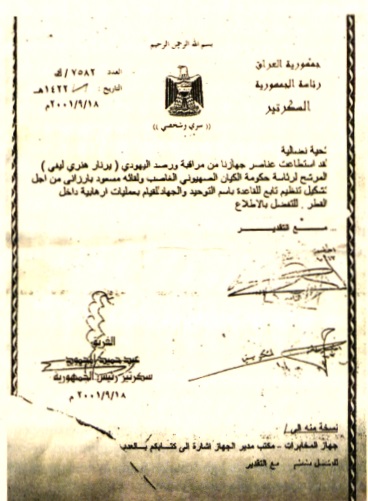 Belge: Siyonist Yahudi “Bernard-Henry Levy” ile “Mesud Barzani”nin mutabakatı ile Dinî görünümlü Terör örgütünün kurulduğunu belgeleyen Irak Cumhuriyeti Başkanlık Sekreterliği Sayı: K/7582 Tarih 18/9/2001’li İstihbarat Raporu (Ağar, 2015: 432.)