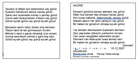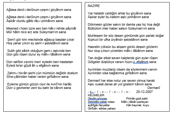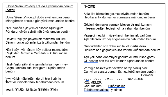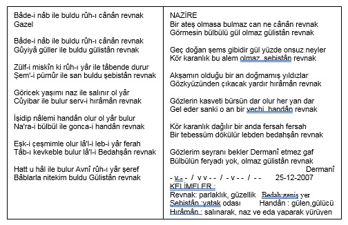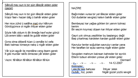 Yine aynı şekilde aşağıda geçen gazelde de aynı motiflerin işlendiği görülmektedir.