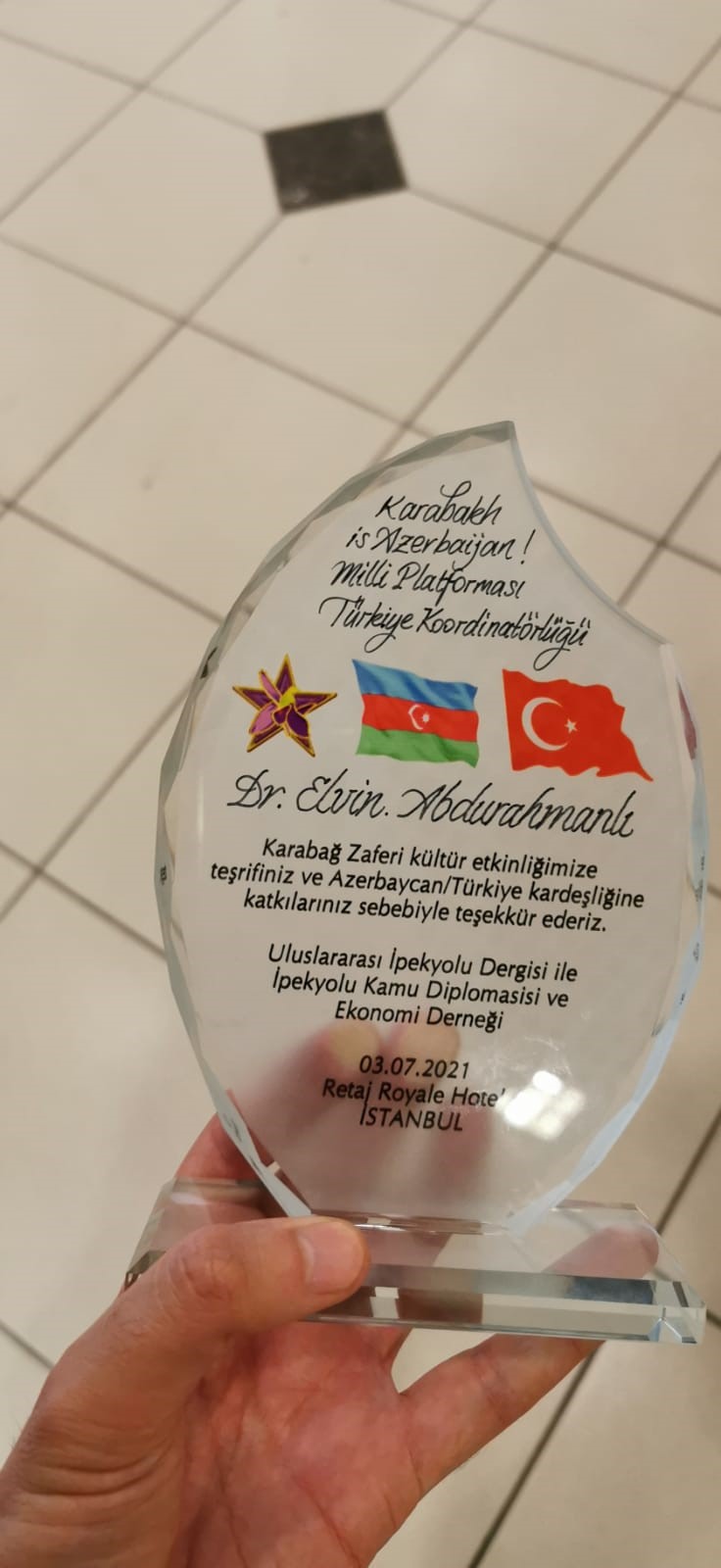 Koordinatörlüğümüzü temsilen şahsıma da, İkinci Karabağ Savaşı sırasında uluslararası arenada Azerbaycan’a verdiğimiz destekten dolayı, Prof. Dr. Cemal Okuyan tarafından bir teşekkür plaketi verildi.