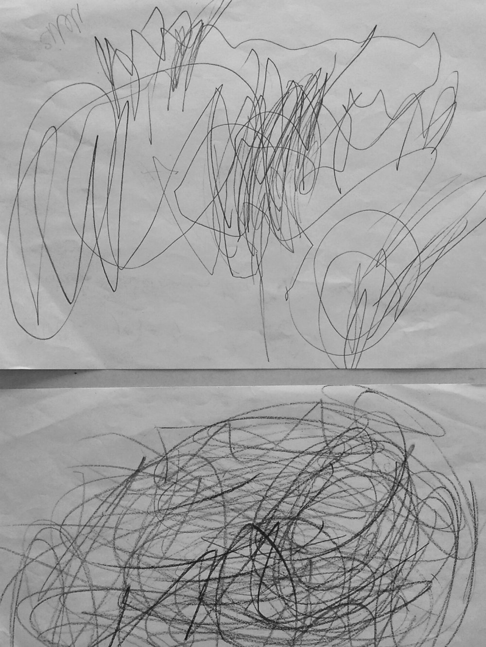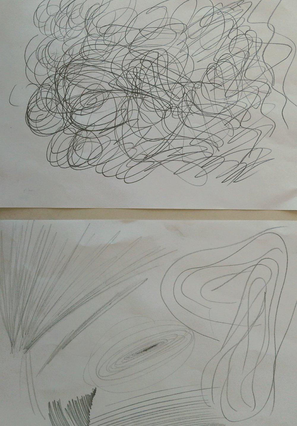 Fotoğrafını sunduğumuz çalışmaların ikisi dört yaşındaki çocuğa, ikisi de yetişkinlere ait karalamalardır. Aradaki fark açıkça görülüyor. Karalama için iki veya üç yaş çocuğunu örmek alabiliriz. Bizi ancak cocuk bakışı yargısız, beklentisiz, kaygısız bakış, akışa uyumlu hale getirir. Akıl boyunduruğundaki el o zaman özgür olur. Kendiliğinden olan güzellik, o zaman bizimle buluşur. Bundan sonra ne yaparsak uygun ve güzel olur. Soyutlayarak zaman ve mekandan kaçmak ruhsal olarak özlenen oluşum yaşanır, dinginleşiriz.