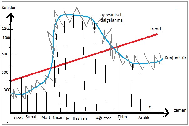 Ocak ayında 300 kasa, Nisan'da 800 kasa, Haziran'da 1000 kasa, Ağustos'ta 1200 kasa, Ekimde 500 kasa meşrubat satılmış. Haziran başında 1500 kasa, ortasında 1800 kasa, sonunda da 1500 kasa satıldığı görülüyor. Grafiktede görüldüğü gibi Trend birinci dereceden bir doğru, Conjonktür ikinci dereceden eğri, mevsimsel dalgalanmada 3 veya daha yukarı dereceden eğri olarak belirtilmiştir. Derece arttıkça mevsimsel dalgalar artar. Yani aylık, haftalık, günlük ve gün içindeki saatlerdeki satışları gösterir. Konunun kısaca anlaşılması için açıklanmaya çalışıldı. Şimdi değişik ve daha gelişmiş anlatımlar vardır. Benim hatırımda kalan bunlar.. Mevsimsel dalgalnmalar arttıkça aralıklar daralır yani periyodlar küçülür.
