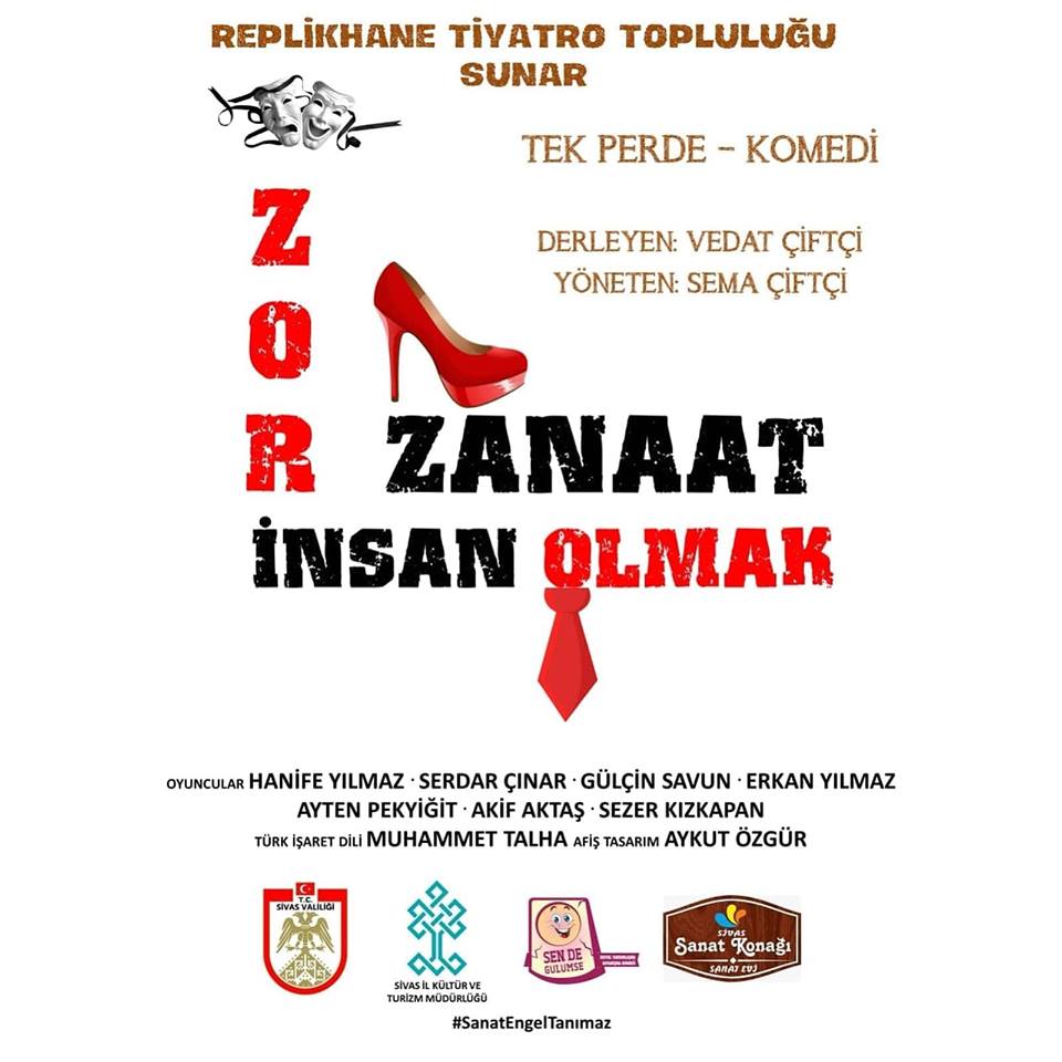 Sende Gülümse Sosyal Yardımlaşma ve Dayanışma Derneği ile Sivas Sanat Konağı-Sanat Evi’nin (Sivas Görsel Sanatlar ve Kültür Derneği) birlikte oluşturduğu “Sanat Engel Tanımaz Projesi” kapsamında, tamamı engelli bireylerden oluşan Replikhane Tiyatro Gurubu 04 Aralık 2018 Salı günü Saat:19.30’da Sivas Atatürk Kültür Merkezi’nde Vedat Çiftçi’nin derlediği “Zor Zanaat İnsan Olmak” adlı komedi oyunuyla seyirciyle buluşuyor.