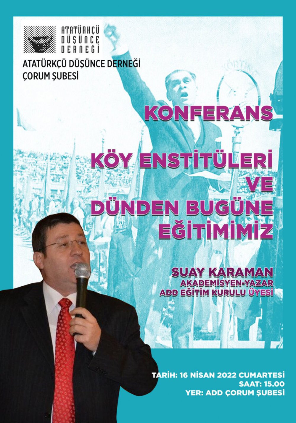 Aynı zamanda ADD (Atatürkçü Düşünce Derneği) Eğitim Kurulu Üyesi ve yine TÜMOD (Tüm Öğretim Elemanları Derneği) Genel Sekreteri olan Suay Karaman'ın, Çorum'da vereceği konferansın konusu "KÖY ENSTİTÜLERİ.."