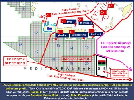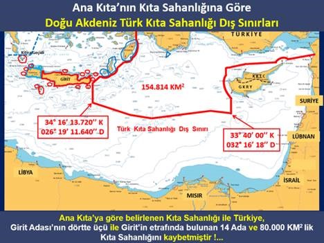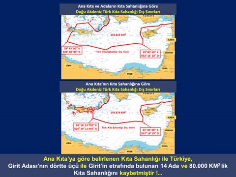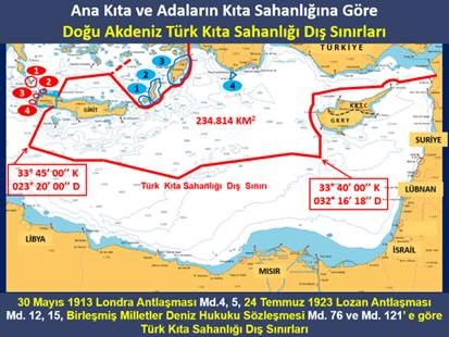 1913 Londra Antlaşması, 1923 Lozan Antlaşması ve Uluslararası Hukuk kurallarına göre Türkiye’nin Doğu Akdeniz’deki Kıta Sahanlığı Sınırları, Gavdos Adası’nın batısından geçmekte, bölgede bulunan Çoban, Kerpe, Rodos ve Meis olmak üzere 4 Yunan adasına sadece karasuları hakkı tanınırken Girit batısında bulunan 4 Türk adasına da sadece karasuları hakkı tanınmaktadır.