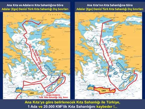 Adalar (Ege) Denizi’nde de Kıta Sahanlığı sınırlarının belirlenmesinde hem ana kıta hem de adaların kıta sahanlığı esas alınmalıdır. Aksi halde Türkiye 1 ada ve 20.000 Km2 lik kıta sahanlığını kaybeder.