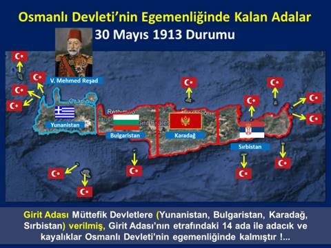 Bir kez daha hatırlatalım; 30 Mayıs 1913 Londra Antlaşması ile Girit Adası, Yunanistan, Bulgaristan, Sırbistan ve Karadağ’a verilmiş, Girit’in etrafındaki 14 ada ile adacık ve kayalıklar Osmanlı Devleti’nin egemenliğinde kalmıştı.