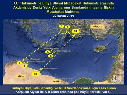 Libya Muhtırası’nın kendi içinde çelişkiler var. Türkiye-Libya Kıta Sahanlığı ve MEB Sınırlandırılması için esas alınan karşılıklı kıyılar ile Türkiye-Libya Orta Hattı/Sınırı arasında çok büyük farklılık olduğu ve sınırın çok kısa tutulduğu açık bir şeklide görülmektedir.