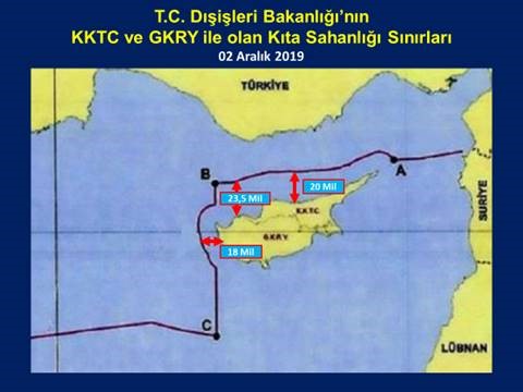 Türkiye, 2011 yılında KKTC ile Kıta Sahanlığı Sınırlandırma Anlaşması imzalamış ve 02 Aralık 2019’da Dışişleri Bakanlığı tarafından yayınlanan harita ile hem KKTC’nin hemde GKRY’nin kıta sahanlığını kabul ve deklare etmiştir. Yani adaların kıta sahanlığı olduğu resmi olarak kabul edilmiştir.