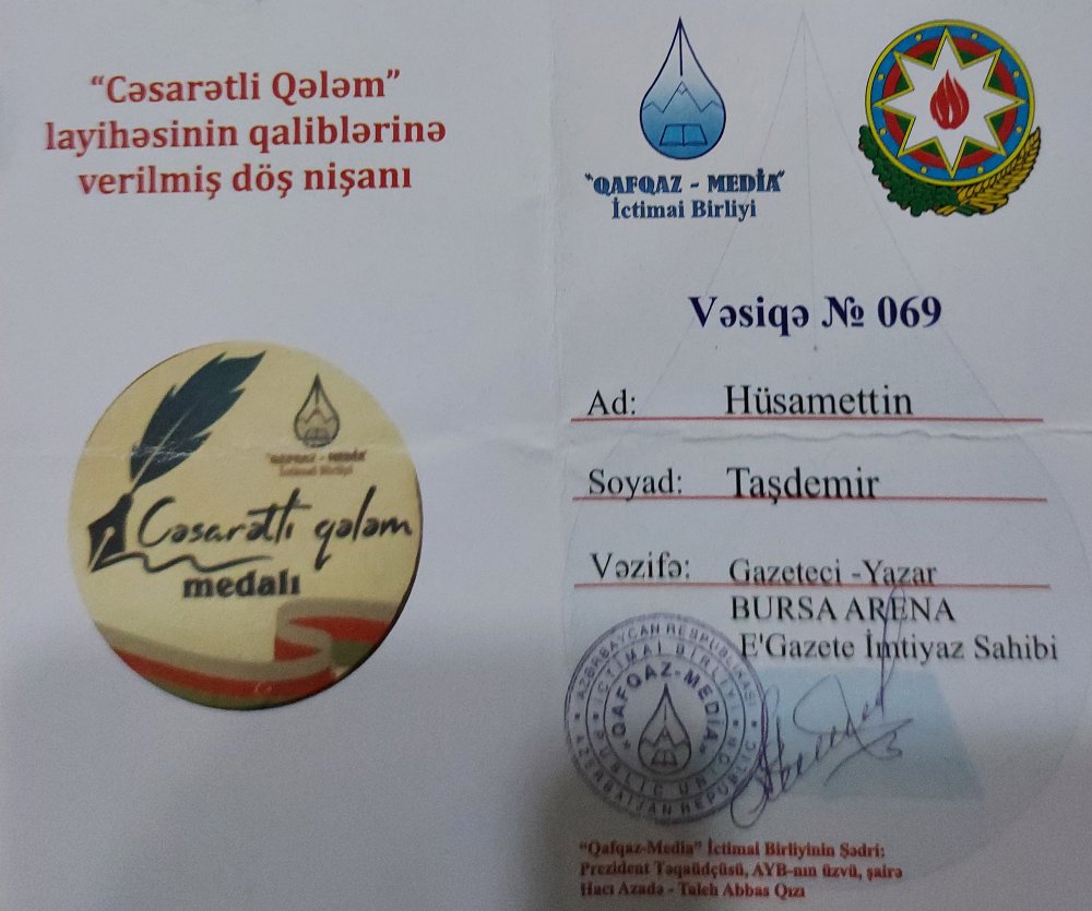 Vefalı Azerbaycan basın ve medyası da bu emekleri karşılıksız bırakmadı. BURSA ARENA E'Gazete Ekibine iki ayrı teşekkür ve takdir sertifikası ile bir madalya ödülü ile takdirde bulundular.