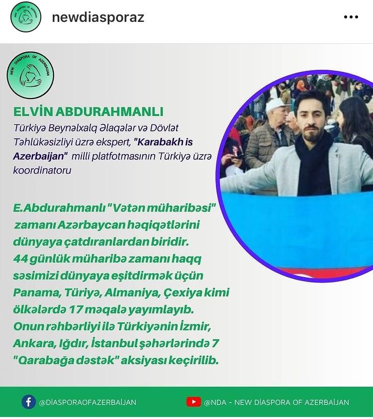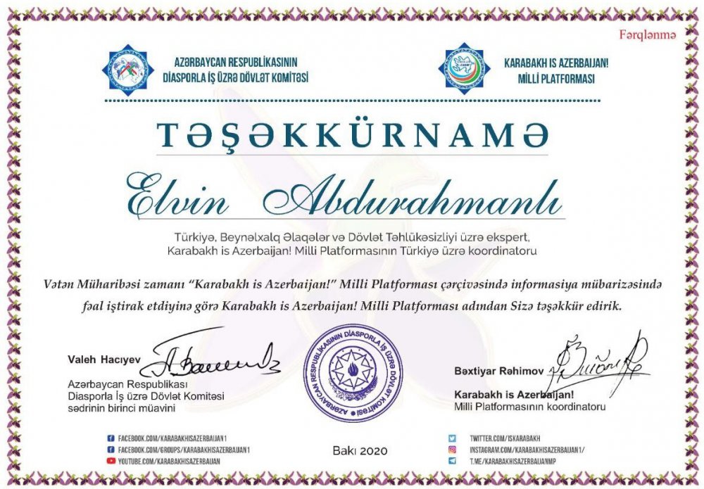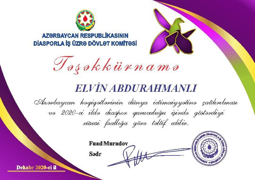 Azerbaycan Cumhuriyeti Diaspora Bakanlığı Tarafından 28.12.2020 tarihinde Dünya Azerbaycanlılarının Dayanışması isimli webkongerede Azerbaycan Cumhuriyeti Diaspora Bakanlığı ‘‘Karabakh is Azerbaijan’’ Milli Platformunun Türkiye Cumhuriyetindeki Koordinatörü Uluslararası İlişkiler ve İstihbarat uzmanı Elvin Abdurahmanlı Azerbaycan Cumhurbaşkanı'nın kararıyla 2. defa “Vatana Üstün Hizmeti”nden dolayı “Üstün Hizmet Teşekkür Belgesi” takdim edilmiştir.