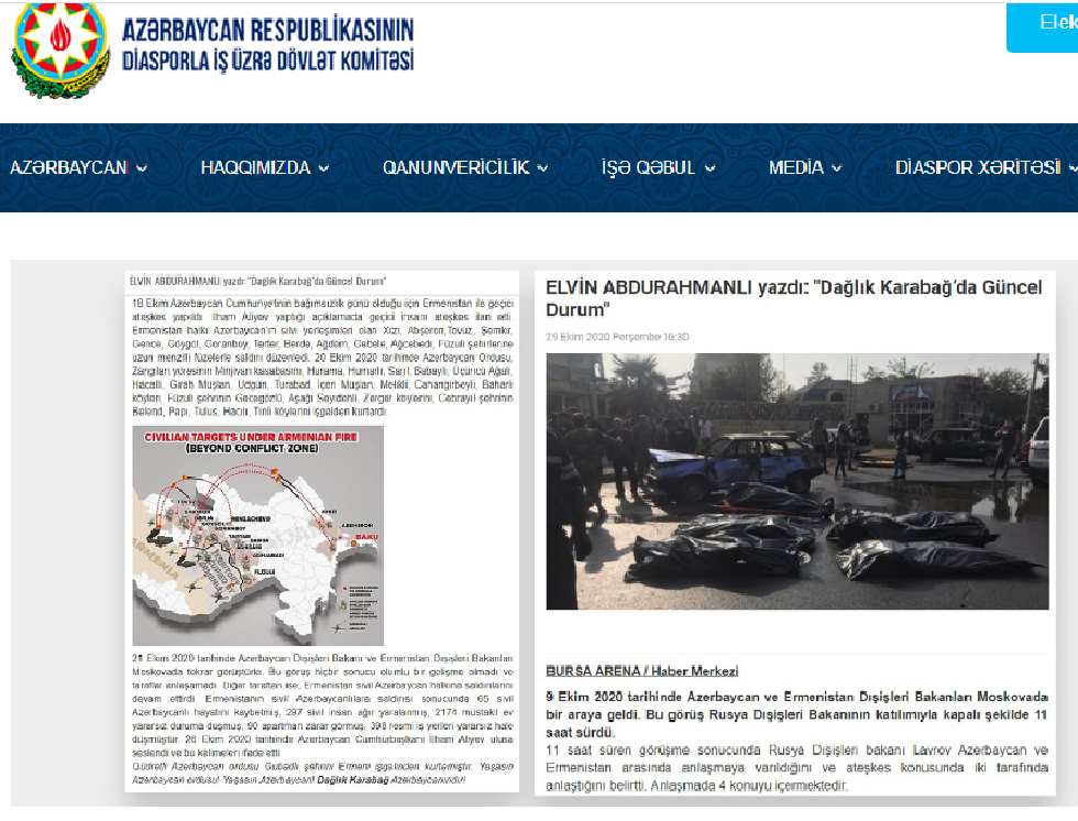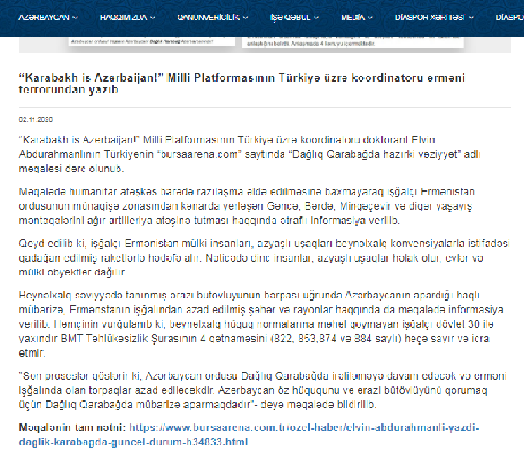 Diaspora Bakanlığı web sayfası / Elvin Abdurahmanlı'nın Bursa Arena E'Gazete'deki takdir gören makalelerinden.
