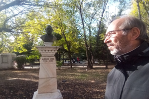 Müzenin bahçesine bakan Romenler ve bahçede baktıkları heykel