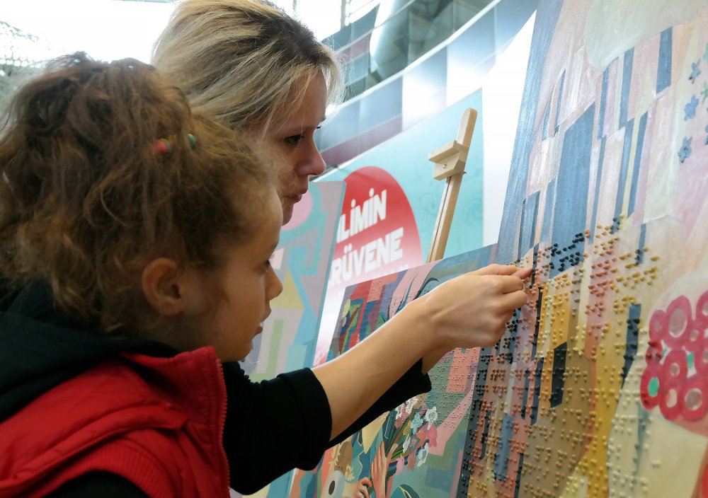 Bursa Büyükşehir Belediyesi Bilim ve Teknoloji Merkezi’nin ev sahipliğindeki sergide, tuval üzerine işlenen kabartma harflerle betimlenen resimler, görme engellileri de sanatla buluşturdu. Serginin ziyaretçileri, Braille alfabesiyle betimlenen resimleri dokunarak anlamaya çalıştı.