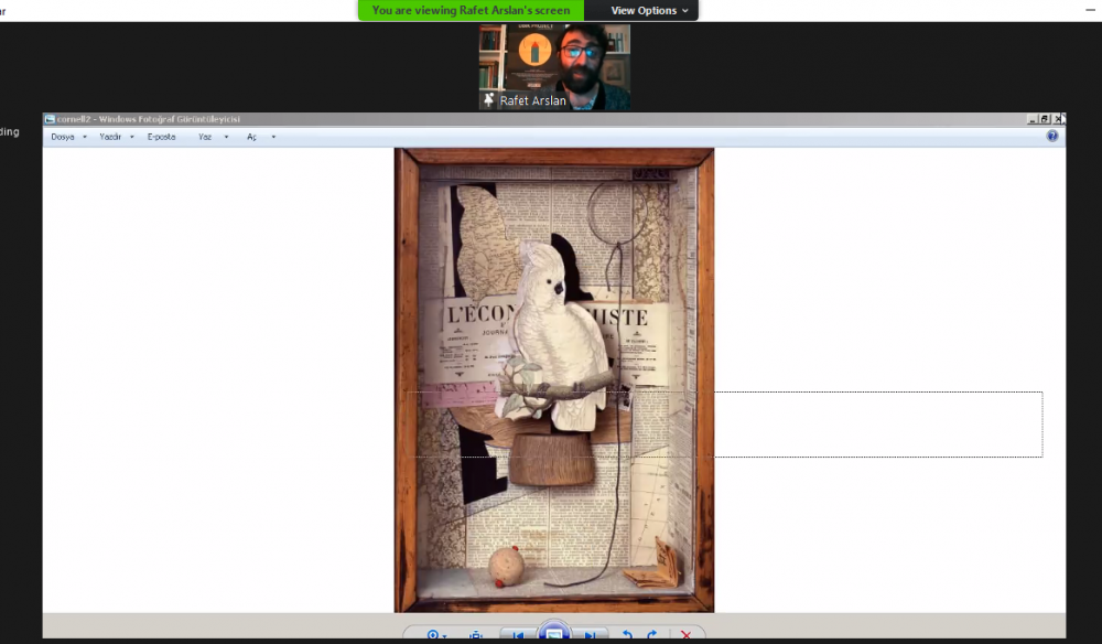 Kolaj sanatındaki yeni yaklaşımlara ve kolaj estetiğinin yaratıcı örneklerine değinen Rafet Arslan katılımcıların sorularını da yanıtladı. Arslan, katılımcıların ilgiyle takip ettiği oturumun sonunda sanatseverlere seslenerek “Kağıdı makası elinize alın kolaj yapın. Kolaj insanın sabrını artırır, kişinin nesneye bakışını değiştirir” ifadelerini kullandı.