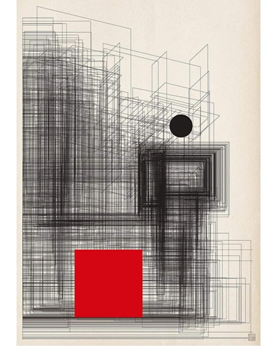 Kamuran: Ne yapmış böyle ya? Beton içine sıkışmış insanlık. İnsana benzettiğim figürü incelediğimde sonsuzluğu algılıyorum. Ancak sonsuzluk gitgide azalıyor. Kırmızı boyutsuz dev kare, bakışımda küp gibi görünmeye yatkın. Her seferinde onun küp olmadığını söylüyorken yakalıyorum kendimi! Derinlikten yoksun bir yere terkedesim var. Kırmızı bu dünyayla ve betonla ilgili geliyor bana. Kare kırmızılığı ile çok rol çalma isteği içinde! Ama bütün buna izin vermeyecek kadar güçlü kurgulanmış.