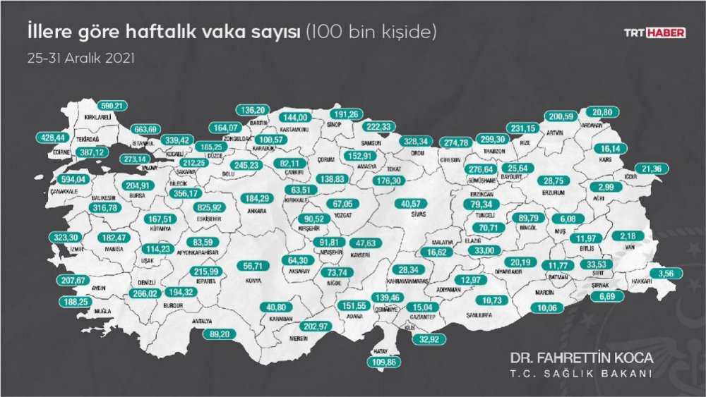 Sağlık Bakanı Fahrettin Koca, 2021 yılı son haftasının koronavirüs vaka haritasını açıkladı. Vaka sayılıları yönünden 57 ilde artış görülürken bazı büyükşehirlerde katlanarak arttı. 100 bin kişide en yüksek vaka sayısı 825,92 ile Eskişehir'de görüldü. İstanbul'da da artış 2 katına çıktı. En düşük sayı ise yine Van'da.