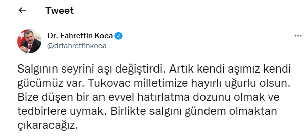 Sağlık Bakanı Dr Fahrettin Koca sosyal medya hesabından yaptığı paylaşımında, "Salgının seyrini aşı değiştirdi. Artık kendi aşımız kendi gücümüz var. Tukovac milletimize hayırlı uğurlu olsun. Bize düşen bir an evvel hatırlatma dozunu olmak ve tedbirlere uymak. Birlikte salgını gündem olmaktan çıkaracağız." dedi.