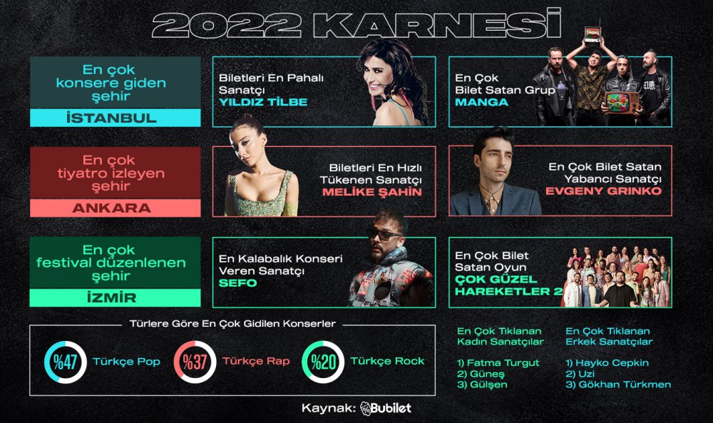 2022’de dinleyicilerin %47’si Türkçe pop, %33’ü rap türlerindeki konserleri tercih etti. %20’si ise Türkçe rock konserlerine akın etti. 2022’de en çok bilet satılan festivallerin başında ‘What a Fest’ geldi. Festivallerin parlayan grubu ise Duman oldu. Rap sanatçısı Sefo başarısını 2022’deki en kalabalık konsere ev sahipliği yaparak taçlandırdı. Biletleri en hızlı tükenen sanatçı Melike Şahin ‘diva bebe’ olarak anılmaya başlandı. Bileti en çok satın alınan müzik grubu Manga iken, Evgeny Grinko yılın en çok bilet satan yabancı ismi olarak kayıtlara geçti. Yıldız Tilbe ise en pahalı konser biletleriyle yıla damgasını vurdu.