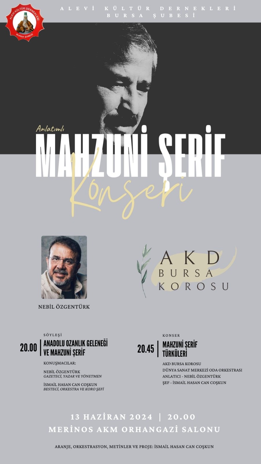 Orkestra ve Koro Şefi İsmail Hasan Can Coşkun yönetimindeki Alevi Kültür Dernekleri (AKD) Bursa Şube Çok Sesli Korosu, Aşık Mahzuni Şerif’in, yönetimlere ve iktidarlara karşı eleştirel bakışını, halkın sesi olma misyonuyla birleşen unutulmaz eserlerini ve onun sanatını unutulmaz kılan eserlerini en güzel şekilde seslendirecek.