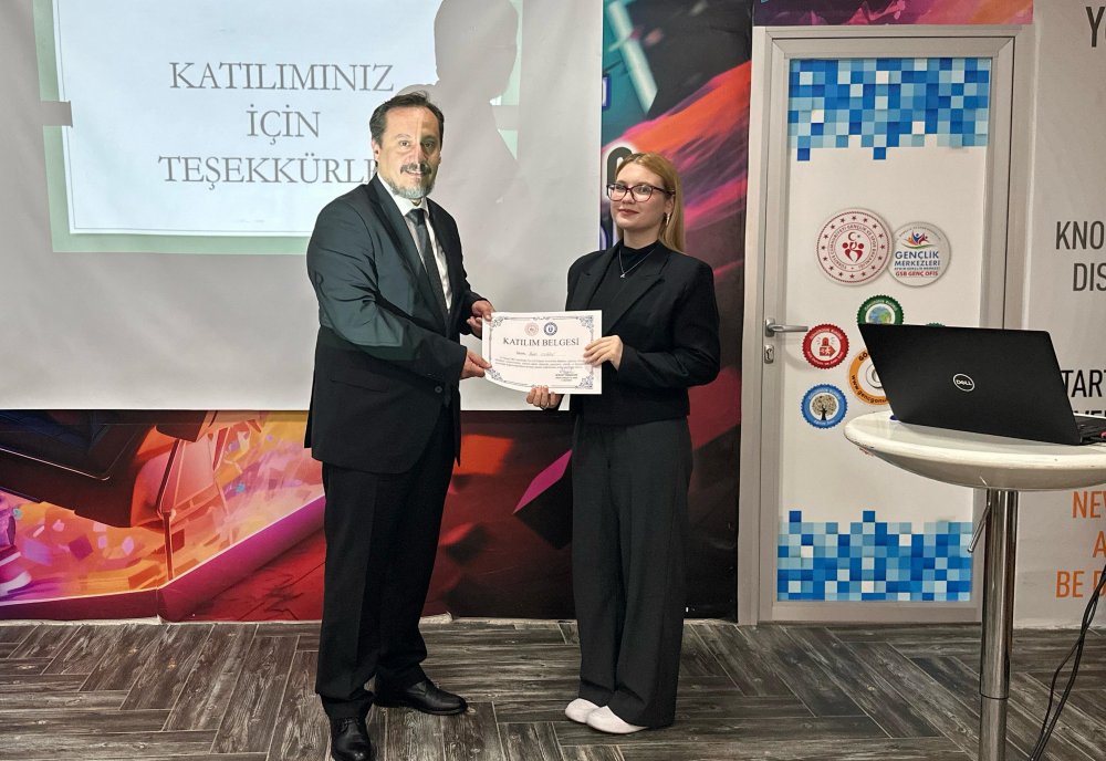 Etkinlik sonrasında gençlere sertifikalarını takdim eden ADÜ İletişim Fakültesi Dekanı Prof. Dr. Mustafa Yılmaz, kendi öğrenciliği ile bugünküler arasında kısa bir mukayesede bulunup, Moderatör Prof. Dr. Turan Akkoyun ile birlikte konuşmacı gençlere teşekkür etti.