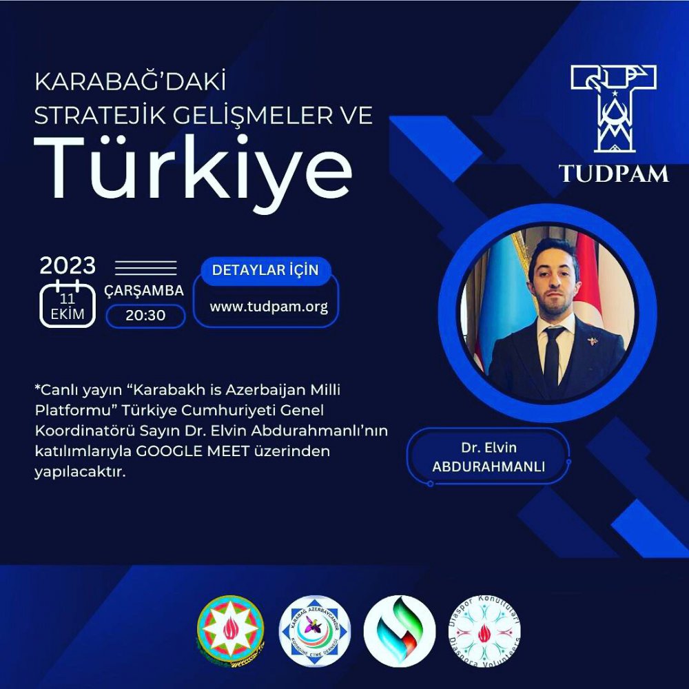 “Karabakh is Azerbaijan Milli Platformu” Türkiye Cumhuriyeti Genel Koordinatörü Dr. Elvin Abdurahmanlı’nın katılımıyla gerçekleşecek olan program ücretsiz olup, Webinar sonrasında TUDPAM tarafından katılımcılara E-Sertifika verileceği de açıklandı.