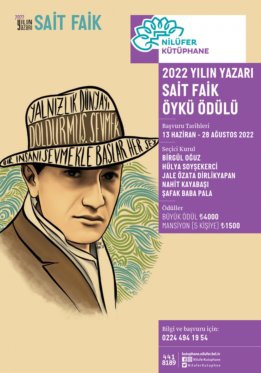 Ödüle başvuran eserleri Jale Özata Dirlikyapan, Nahit Kayabaşı, Birgül Oğuz, Şafak Baba Pala ve Hülya Soyşekerci’den oluşan Seçiçi Kurul değerlendirecek. Öykü Ödülü sonuçları 31 Ekim 2022 tarihinde açıklanacak. Büyük ödülü kazanan 4 bin TL ödül alacak, 5 kişi de 1500 TL’lik mansiyon ile ödüllendirilecek. 2022 Yılın Yazarı: Sait Faik Öykü Ödülü için başvuruda bulunmak isteyenler başvuru formunu www.nilufer.bel.tr/oykuodulu linkinden alabilecek.
