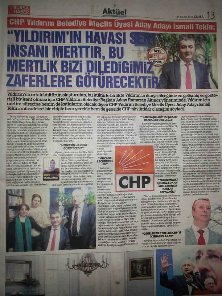 Belediye meclis üyesi aday adaylığı sürecimde yapmış olduğumuz çalışmalarda birlikte hareket ettiğim arkadaşlarımın yüksek performanslı çalışmaları ile ön seçime girme kararı vererek hep birlikte ön seçime girdik. Normal şartlarda tanıdıklarımın yardımı ile belki de kontenjan adayı olarak yer bulma ihtimalim olmasına rağmen koşulsuz ve şartsız ön seçime girme iradesini ortaya koydum. Ön seçime girdim ve çok az tanınmama rağmen ön seçimde seçilen 21 aday arasında yer aldım. 21 aday içinde bir arkadaşımız evraklarını teslim edemeyince 20. sırada ve Yıldırım İlçemizde toplam 40 Belediye Meclis Üyesi adayı içinde sonuncu olarak yer aldım. Bu benim için oldukça önemli bir sonuçtu. Grup arkadaşlarımın emekleri çok olmasına rağmen kararlı bir mücadelenin olumlu bir sonucunu aldığıma inandım ve hala da buna inanıyorum. Dönem itibarıyla beraber mücadele ettiğimiz arkadaşlarımı yürekten kutluyorum, onlara samimi emeklerinden dolayı takdir ve teşekkürlerimi sunuyorum.