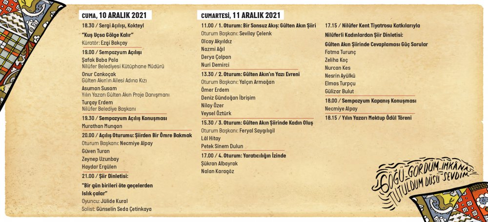 Nilüfer Belediyesi tarafından düzenlenen “Şiirden Bir Ülke Bahçesi 2021 Yılın Yazarı Gülten Akın Sempozyumu” 10 – 11 Aralık 2021 tarihlerinde Nâzım Hikmet Kültürevi'nde gerçekleştirilecek.