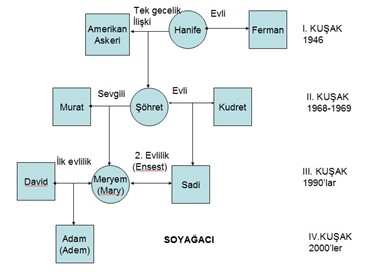 “Meryem” Londra'da “Sadi” Türkiye'de büyümüştür. Fakat “bir gecelik aldatmadan bir şey olmaz” diyen düşüncenin 1990'lardaki 3. kuşağı ensest (genetik, ahlaki, hukuki ve dini bakımdan evlenmeleri yasak olan yakın akraba konumundaki bireylerin cinsel ilişkide bulunmaları) bir evlilikle sonuçlanmıştır. 4. kuşak 2000'lerde bir pedofili olan dayısı tarafından istismar edilen masum ve korumasız “Adem”le devam edecektir. “Hanife” “Ferman” ve ismi bilinmeyen “Amerikalı asker” birinci kuşağı oluşturduktan sonra “Kudret” ve “Şöhret”ten devam eden “Soyağacı”nda hastanede bebeklerin karışması dâhil farklı ailelerde büyüyen çocuklar da romanda görülecektir. Bu romanda bir insan anne veya baba olsun kutsal değerlerini korumak için bir hassasiyet göstermezse meydana gelecek sonuçların gelecek kuşaklarda ensest ihtimalinin ne kadar yüksek olduğunu ortaya koymaktadır.