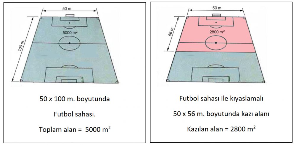 Ortalama bir futbol sahasının eni 50 m., uzunluğu da 100 m. olarak kabul edilirse, söz konusu futbol sahası yaklaşık 5,000 m2 alan kaplamaktadır.
