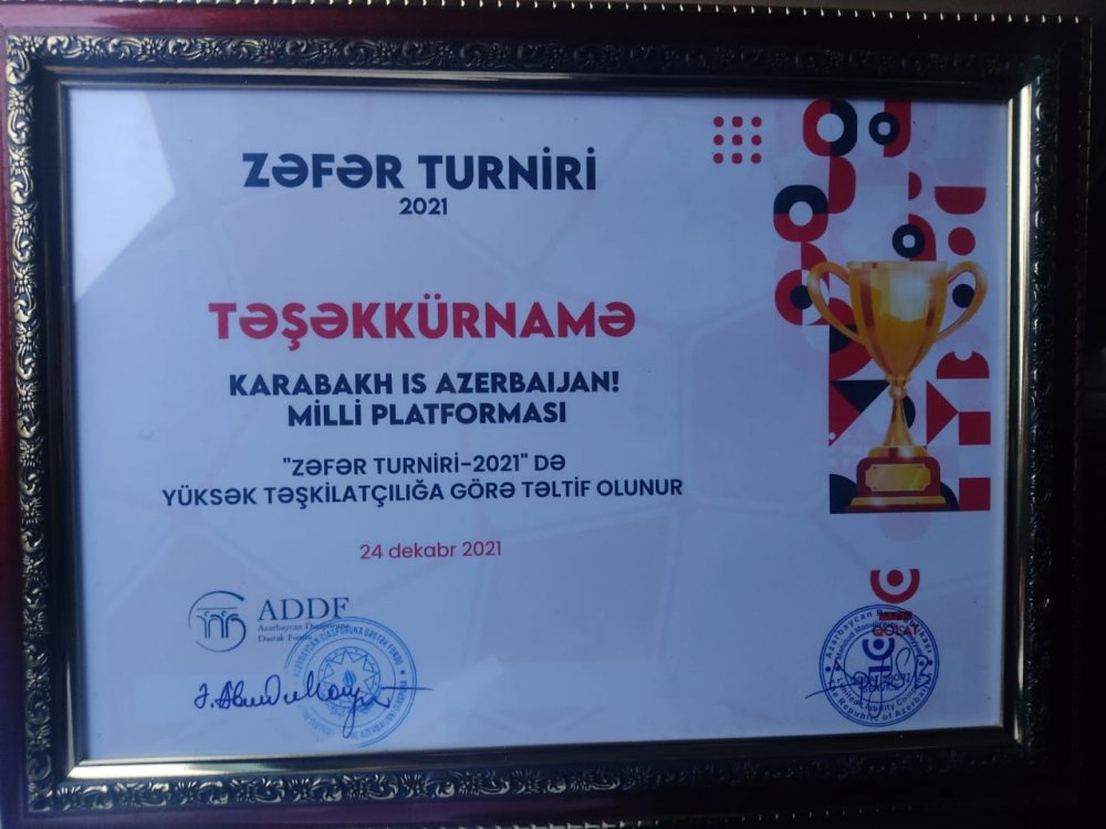 Azerbaycan Diaspora Bakanlığı, KİAMP (Karabakh is Azerbaijan Milli Platformu Türkiye Genel Koordinatörlüğü), "Karabağ Azerbaycan’dır Koordine Etme Derneği" ve AFFA (Azerbaycan Futbol Federasyonu) ile birlikte Karabağ zaferinin 1. Yıl dönümüne hitaben düzenlediği ‘‘ZAFER Turnuvası’’ isimli 45 günlük futbol turnuvası başarıyla tamamlandı.