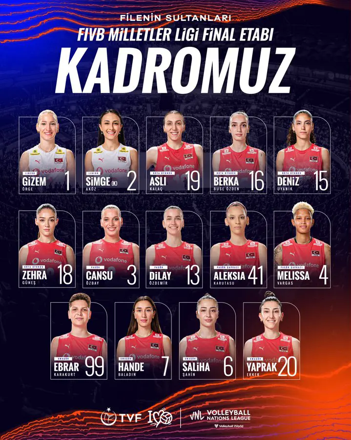 Türkiye Voleybol Federasyonu'ndan yapılan açıklamada kadroda Gizem Örge, Simge Aköz, Aslı Kalaç, Berka Buse Özden, Deniz Uyanık, Zehra Güneş, Cansu Özbay, Dilay Özdemir, Aleksia Karutasu, Melissa Vargas, Ebrar Karakurt, Hande Baladın, Saliha Şahin ve Yaprak Erkek yer aldı.