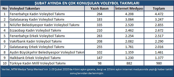 Tedirginlik saçmaya devam eden corona virüsü spor camiasını da etkiledi. CEV Şampiyonlar Ligi Çeyrek Final eşleşmelerinde İtalyan rakiplerle karşılaşacak olan Fenerbahçe Kadın Voleybol Takımı, İtalya’da Koronavirüs vakası sayısının yüksek olması sebebiyle CEV’e başvurarak maçların ertelenmesini talep etti. Şubat ayı boyunca medyada 4 bin 472 habere yansıyan sarı-lacivertli takım en çok konuşulan voleybol takımı olmayı başardı. Sarı-lacivertli takımı sırası ile 3 bin 247 haber ile Galatasasaray Kadın Voleybol Takımı ve 2 bin 855 haber ile Nilüfer Belediyespor Kadın Voleybol Takımı takip etti.