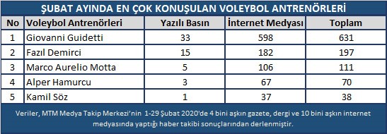 Filenin Sultanları’nın ve VakıfBank’ın Teknik Direktörü Guidetti, takımlarına kazandırmaya devam etti. Vakıfbank ile Şampiyonlar Ligi'nde Kaliningrad'ı 3-0 mağlup ederek, gruptan lider olarak çeyrek finale çıkaran başarılı çalıştırıcı, voleybol severlerlerden destek istemeyi de unutmadı. Medya Takip Merkezi’nin aynı raporuna göre, ay boyunca medyada 631 habere yansıyan Guidetti, Şubat ayını da yıldız çalıştırıcı olarak kapattı. Guidettiyi sırası ile başarılı antrenörlerden 197 haber ile Fazıl Demirci ve 111 haber ile Marco Aurelio Motta takip etti.