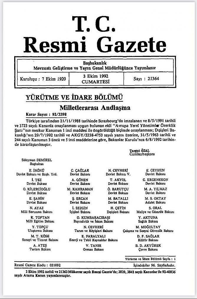 3 Ekim 1992 — Sayı : 21364 RESMİ GAZETE Sayfa ; 3