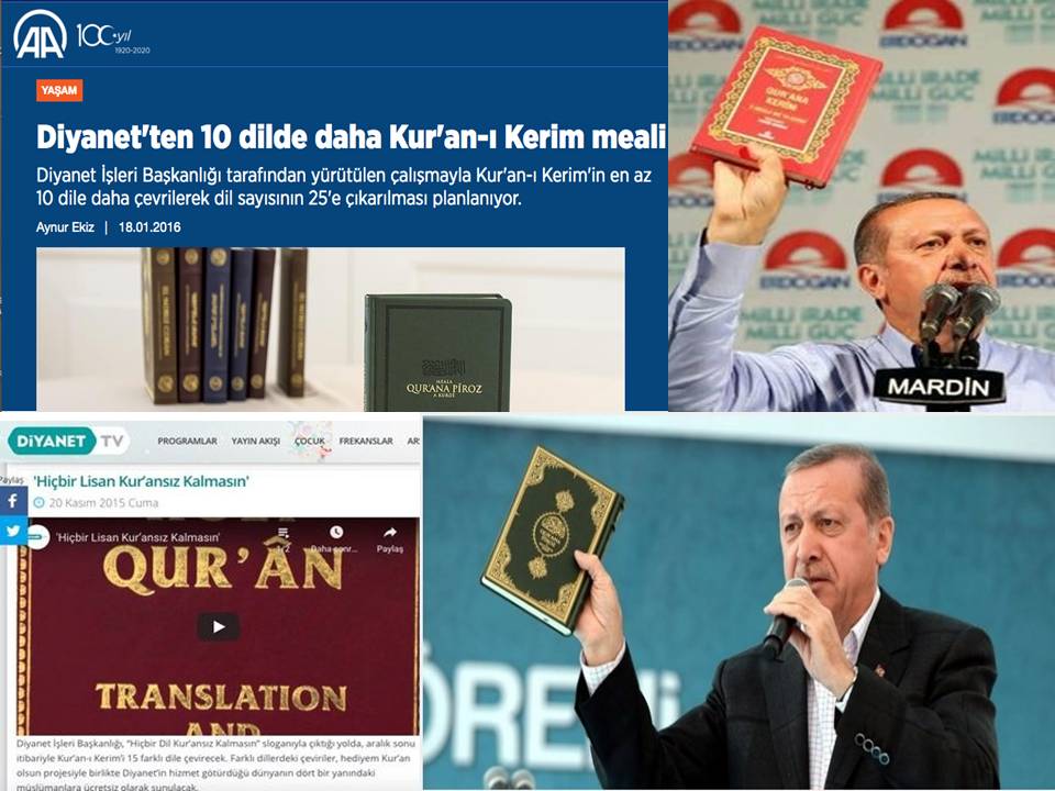 Tayyip Erdoğan, Ağustos 2014 tarihinde cumhurbaşkanlığı seçim sürecinde Ensar Vakfı’nın bastırdığı Kuran’ın Kürtçe çevirisini miting kürsüsünden halka göstermişti. 2015 seçim döneminde Batman, Diyarbakır, Van, Mardin, Siirt’te elinde Kürtçe Kuran ile propaganda yapması dine aykırı sayılmadı. Ancak Türkçe Kuran okumak dine aykırı, “caiz” değilmiş. Kendileri birçok dilde Kuran olması ile gösteri yaparken, İstanbul'da Türkçe okunan Kuran için ortalığı ayağa kaldırmak nasıl bir ruh halidir?