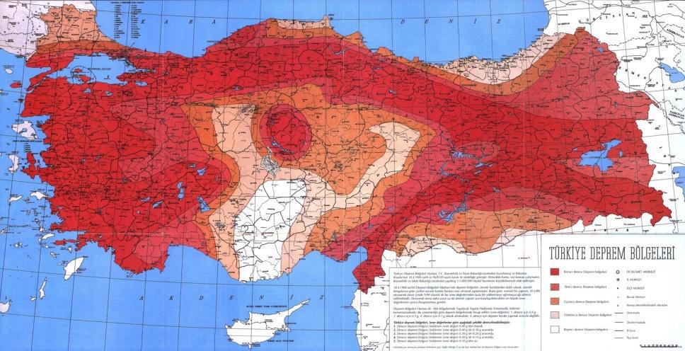 Harita 1: Çevre ve Şehircilik Bakanlığı (eski adıyla Bayındırlık ve İskân Bakanlığı) tarafından hazırlanan Türkiye Deprem Bölgeleri Haritasında gösterildiği gibi, Türkiye'deki il ve ilçelerin çoğu aktif sismik bölgeler üzerinde yer almaktadır. (2)
