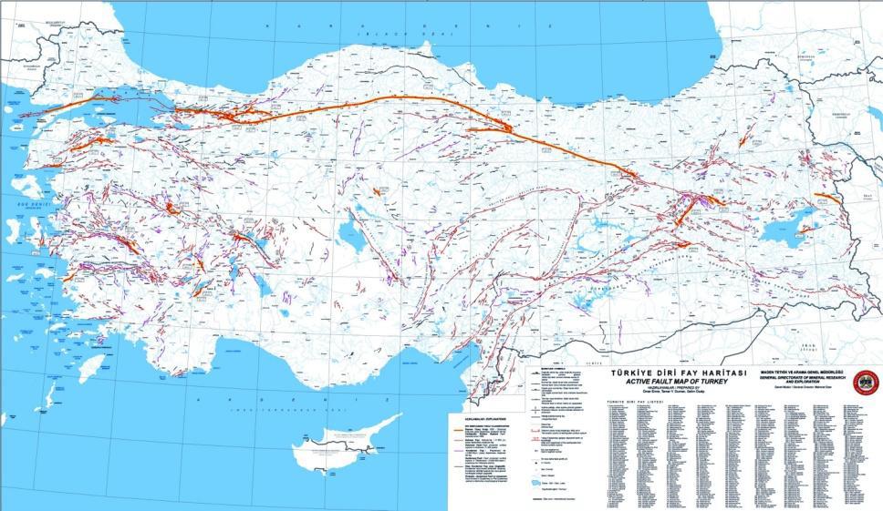 Harita 2: Türkiye Aktif Fay Hatları Haritası. 2012 yılında Maden Tetkik ve Arama Genel Müdürlüğü tarafından hazırlanmıştır. www.mta.gov.tr [2012 yılında erişilmiştir].(2)
