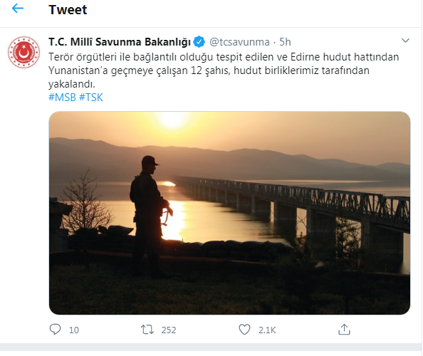 Milli Savunma Bakanlığı'ndan yapılan son açıklamaya göre; Terör örgütleri ile bağlantıları olduğu tespit edilen 12 şahıs Edirne'den Yunanistan'a geçmeye çalışırken yakalandılar.