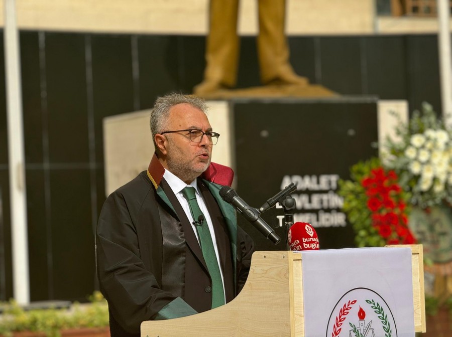 Bursa Barosu Başkanı Av. Metin Öztosun, "En önemli fonksiyon adalet ise adalet terazisinde ölçerek hukukun gerçek potansiyelini sağlamalıyız. Devletin temeli olan, adaletin olmadığı, yaratılamadığı ya da ulaşılmasının zorlaştığı sistemle adalete olan inançla birlikte kudreti de yok oluyor. İktidarların yargıyı bağımsız bırakmayıp kendi politikalarına göre hareket etseler de güveni kaybetmiş adalet mekanizması, devlet mekanizması içinde kocaman bir boşluk oluşturuyor. Yaratılmaya çalışan hukuka karşı söz söylemekle yükümlüyüz. Bizlerin karşı çıktığı, 2017 değişikliklerinden sonra insanların hukuka olan güvenini de sarsmaktadır. Ekonomiden gelir dağılımına, sosyalden eğitim hakkına, siyasaldan kadın haklarına can yakıcı gündemler içinde boğuşup duruyoruz. Yargının bağımsızlığı getirdiği bu sistemde kağıt üzerinde kalan hukuk üstünlüğü için mücadele ediyoruz. Hukukun üstün olmadığı ortamlarda temel haklara sahip olmamız, mesleğimizi yapabilmemiz çok zor. O yüzden önce hukuk diyoruz. İtirazlarımızdan hoşlanmayan, iktidara bağlı barolar yaratmaya, yasal ve fiili uygulamalarla avukatları en alt seviyeye itmeye çalışıyorlar" şeklinde konuştu.