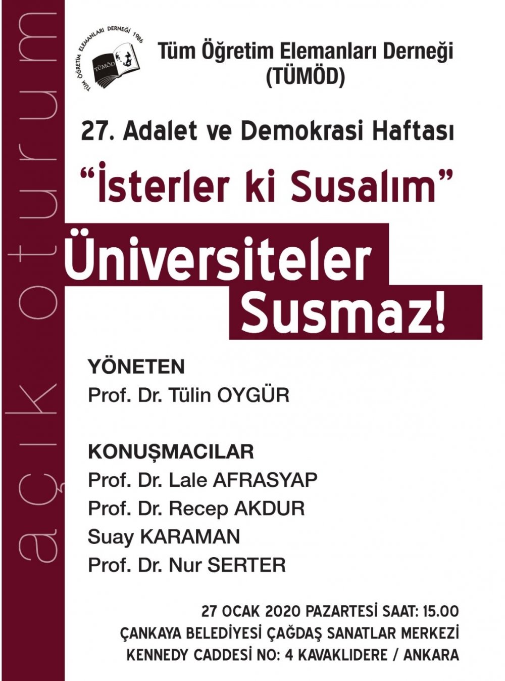 TÜMÖD (Tüm Öğretim Elemanları Derneği) 27. Adalet ve Demokrasi Haftası nedeniyle bir açık oturum proğramı düzenledi.