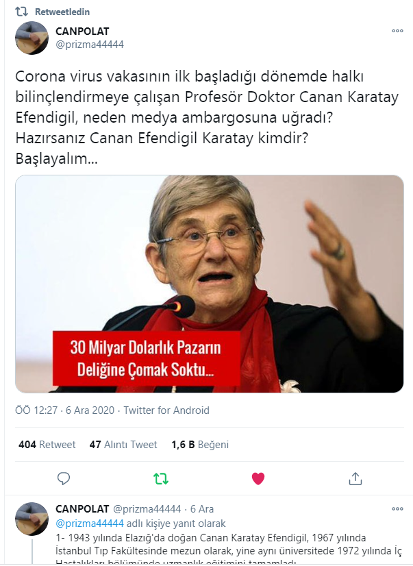 1943 yılında Elazığ'da doğan Canan Karatay Efendigil, 1967 yılında İstanbul Tıp Fakültesinde mezun olarak, yine aynı üniversitede 1972 yılında İç Hastalıkları bölümünde uzmanlık eğitimini tamamladı. Liverpol Regional Cardiac Center'da kardiyoloji dalında uzmanlık eğitimini tamamlayarak, 1974-1976 yılları arasında İstanbul Üniversitesi Tedavi Kliniği'nde baş asistan olarak görev yaptı. Türkiye'de bir kardiyolog olarak cerrahi müdahale olmadan bir ilki gerçekleştirmiştir. Kalıcı ve geçici kalp pili implantasyonu tekniğini başarıyla uygulayarak, Koroner Yoğun Bakım'da 'Vena Subklavya Ponksiyon' tekniğini yerleştirmiştir. 1976-1978 yılları arasında, G.Afrika Cape Town Üniversitesin de dünyada ilk kez kalp nakli ameliyatını gerçekleştiren, Christian Barnarnd'ın ekibinde çalıştı. Doçentlik tezini kalp nakli yapılmış hastalar üzerinde gerçekleştirerek 1979 yılında doçent oldu. İstanbul Üniversitesi Kardiyoloji Enstitüsü'nde, şu anda ülkemizde yaygın bir şekilde uygulanmakta olan 'femoral arter' yolu kullanılarak yapılan koroner anjiyografi tekniğini (Judgkin tekniği) yine ilk kez ülkemizde uyguladı ve bu uygulamayı ülkemize yerleştirdi. 1987-1995 yılları arasında New York Üniversitesinde kalp hastalıkları alanında araştırmalar yaptı. 1995'de yılında G.Antep ve İstanbul'da koroner yoğun bakım ve koroner anjiyografi labaratuvarlarını kurdu. 1997-2002 yıllarında Yeditepe Üniversitesi, 2002-2006 yıllarında Kadir Has Üniversitesi'nde öğretim üyesi, 2006-2010 yıllarında ise Bilim Universitesi'nde Rektörlük yaptı. Canan Karatay Efendigil, halen İstanbul'da özel bir hastanede kardiyolog olarak görev yapmaktadır. Şimdi gelelim bilgiseldeki ilk fotonun kısa hikayesine... Profesör Karatay, ezber bozan açıklamaları ile her zaman, tıp dünyası ile karşı karşıya kalarak eleştiri oklarının hedefi olmuştur. Karatay'ın ezber bozan açıklamalarından biride kolestrolün tek başına zararlı olmadığını söylemesidir. Bu açıklama ile yaklaşık 30 Milyar dolarlık bir pazara sahip olan ilaç firmalarının hedefi olmuş ve itibarsızlaştırılmaya çalışılmaktadır. Corona salgının ilk başladığı dönemde sözleri bir daha hatırlatmakta fayda var "Coronavirüs viral bir enfeksiyondur. Coronavirus için aşı yapamazsınız..." Ve son olarak Karatay'in kendi İnstagram hesabında ki fotosu ile bitirelim...