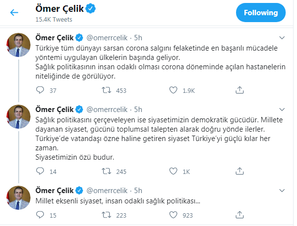 AK Parti Sözcüsü ve MKYK Üyesi Ömer Çelik, sosyal medya hesabından yaptığı açıklamada "Sağlık politikasının insan odaklı olması, korona döneminde açılan hastanelerin niteliğinde de görülüyor. Sağlık politikasını çerçeveleyen ise siyasetimizin demokratik gücüdür." dedi.