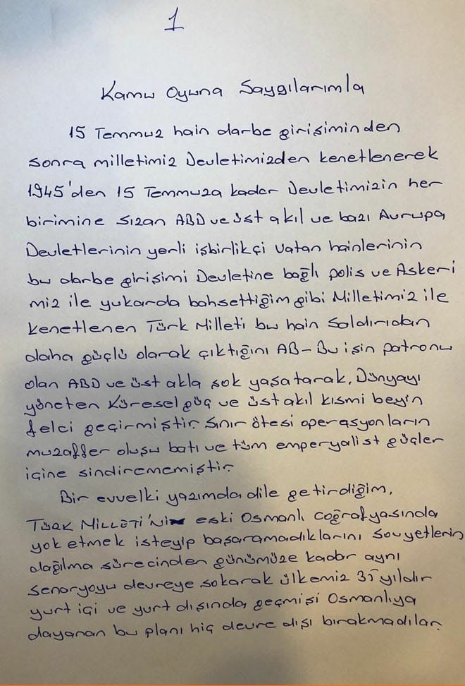 Unutmasınlar ki Türkiye ne bir İran’dır ne bir Irak’tır nede Suriye’dir, çünkü tüm etnik grup unsurlarımızla, aziz vatanımıza gönül vermiş bir milletiz. Kan emici Batı temel hak insan özgürlükleri din ve vicdan özgürlüğü demokrasi havariliği yaparlar. Ama az gelişmiş ülkelerin petrol ve madenlerine sahip olabilmek için dünyayı kan gölüne dönüştüren bu kan emiciler, tarihin derinliklerinde ve Kurtuluş Savaşı'ndan sınır ötesi operasyonlarından terörle mücadeleden bir ders çıkaramamışlar.