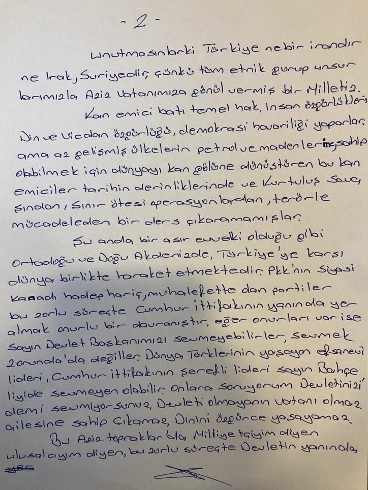 Şu anda bir asıl evvelki olduğu gibi Orta Doğu ve Doğu Akdeniz'de Türkiye'ye karşı dünya birlikte hareket etmektedir. PKK'nın siyasi kanadı Hadep hariç muhalefette olan partiler bu zorlu süreçte Cumhur İttifakı’nın yanında yer almak onurlu bir davranıştır. Eğer onurları var ise, Sayın Devlet Başkanımızı sevmeye bilirler sevmek zorunda da değiller, Dünya Türklerinin yaşayan efsanevi lideri Cumhur İttifakı’nın şerefli lideri Sayın Bahçeli’yi de sevmeyen olabilir, onlara soruyorum Devletinizi de mi sevmiyorsunuz, devleti olmayanın vatanı olmaz, ailesine sahip çıkamaz, dinini özgürce yaşayamaz bu aziz Topraklar da milliyetçiyim diyen, ulusalcıyım diyen bu zorlu süreçte Devletinin yanında batı ve üst akılla dik duran Devletimizin yanında birlikte dik durmak bir kurtuluş savaşı kadar önemlidir. Üst aklın Doğu Akdeniz'de kurduğu oyunu fırsat bilen bazı çevreler gelecek seçim ile ilgili senaryolar hazırlanmaktadır. Önemli olan bu zorlu sürece birlikte göğüslerimizi siper etmektir. Seçim zamanı herkes millet huzurunda eteğindeki taşları o zaman dökebilir. Aziz milletimizin her bireyi her şeyi görüyor seçim hesabı yapmaktan lütfen vazgeçiniz. Libya’da Doğu Akdeniz’de, Güney sınırlarımızda, Ermenistan sınırında ve yurt içinde şerefle mücadele eden Devletimizin yanında olunuz.